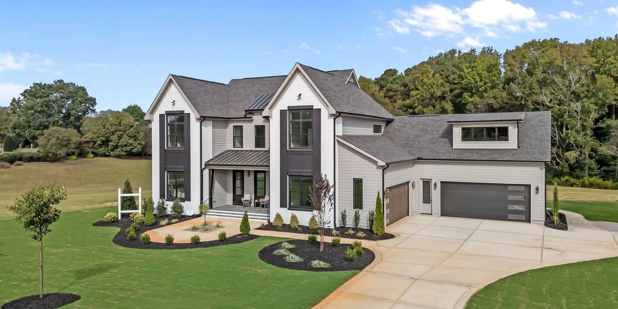 Inside, upgraded trim, elegant finishes, and hardwood flooring span the main living areas with a main-level primary suite, guest suite, and private study.
